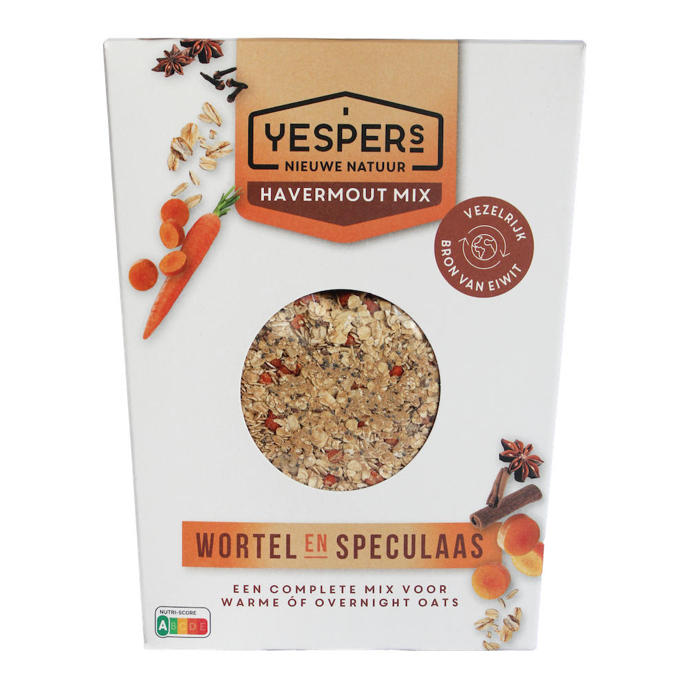 Ingrediënten: Havervlokken 61,5%, appelvezel, chiazaad, rozijnen, wortel 6,3%, lijnzaad en speculaaspoeder 1%.